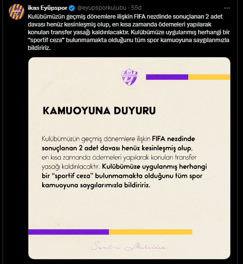 Eyüpspor’dan konuyla ilgili yapılan açıklamada, “Kulübümüzün geçmiş dönemlere ilişkin FIFA nezdinde sonuçlanan 2 adet davası henüz kesinleşmiş olup, en kısa zamanda ödemeleri yapılarak konulan transfer yasağı kaldırılacaktır. Kulübümüze uygulanmış herhangi bir “sportif ceza” bulunmamakta olduğunu tüm spor kamuoyuna saygılarımızla bildiririz” ifadelerini yer verildi.