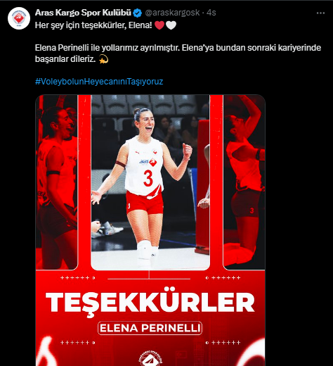 Vodafone Sultanlar Ligi takımlarından Aras Kargo Kadın Voleybol Takımı, kadroda yeniden yapılanmaya giderken Elena Perinelli ve Selen Köse’nin takımdan ayrıldığını duyurdu.