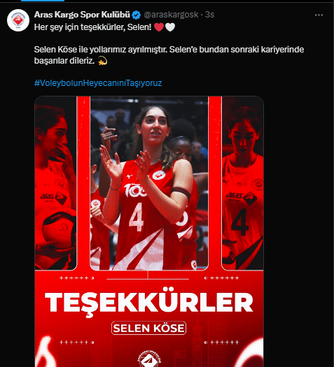 Aras Kargo, son dönemlerde kadroda pek çok ayrılıkla dikkat çekiyor. Daha önce kaptan Gizem Mısra Aşçı, Elif Kapar, Hanna Klimets, Tuana Köse, Büşra Güneş ve Ecesu Soner’in de takımdan ayrıldığı açıklanmıştı.