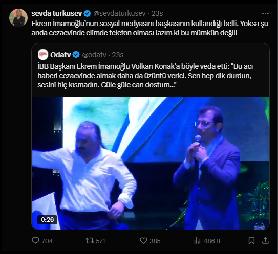 İktidar kalemi Sevda Türküsev, 23 Mart’tan bu yana Silivri’de tutuklu olan Ekrem İmamoğlu’nun sosyal medya hesabını başka birinin yönettiğini paylaşmıştı. Zekasıyla ve büyük oyunu ortaya çıkarmasıyla hayrete düşüren Türküsev sosyal medyada da gündem olmuştu.