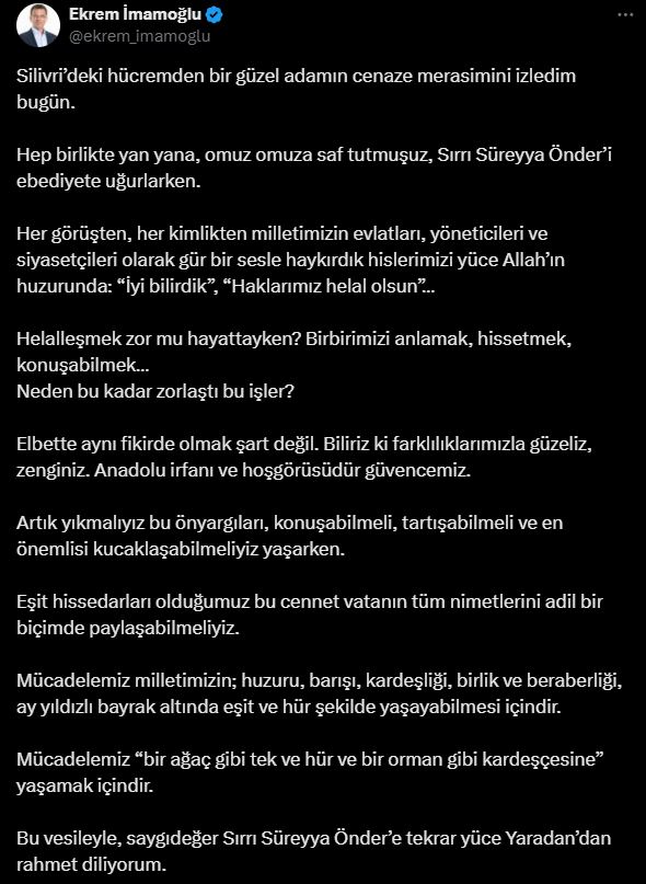 Tutuklu İBB Başkanı ve CHP’nin Cumhurbaşkanı adayı Ekrem İmamoğlu sosyal medya platformu X üzerinden Sırrı Süreyya Önder’in vefatına ilişkin başsağlığı mesajı paylaştı.