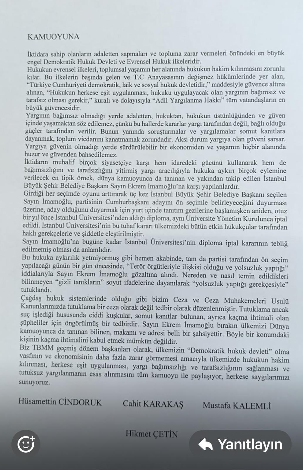 “Sayın İmamoğlu’na bugüne kadar İstanbul Üniversitesi’nin diploma iptal kararının tebliğ edilmemiş olması da anlamlıdır.” ifadelerinin kullanıldığı metinde, “Bu hukuka aykırılık yetmiyormuş gibi hemen akabinde, tam da partisi tarafından ön seçim yapılacağı günün bir gün öncesinde, “Terör örgütleriyle ilişkisi olduğu ve yolsuzluk yaptığı” iddialarıyla Sayın Ekrem İmamoğlu gözaltına alındı. Nereden ve nasıl temin edildikleri bilinmeyen “gizli tanıkların” soyut ifadelerine dayanılarak “yolsuzluk yaptığı gerekçesiyle” tutuklandı.” ifadelerine yer verildi.