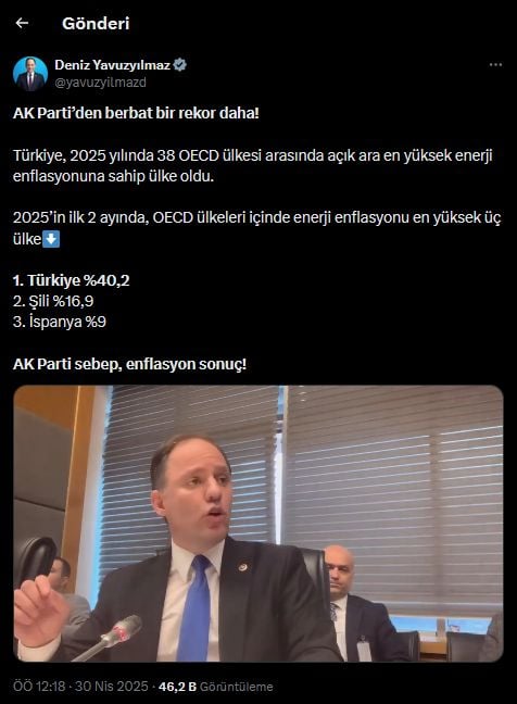 Yavuzyılmaz, Türkiye’nin Ekonomik Kalkınma ve İş Birliği Örgütü’nün (OECD) verilerine göre, 2025 yılında 38 ülke arasında açık ara farkla en yüksek enerji enflasyonun bulunduğu ülke olduğuna dikkat çekti.