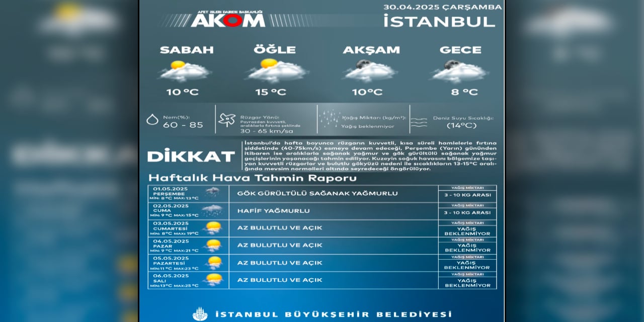 İBB’ye bağlı AKOM’da İstanbullulara kuvvetli rüzgar ve ani düşen sıcaklıklar konusunda uyarılarda bulunurken İstanbul’da olumsuz hava koşullarının hafta sonuna kadar süreceği açıklandı.