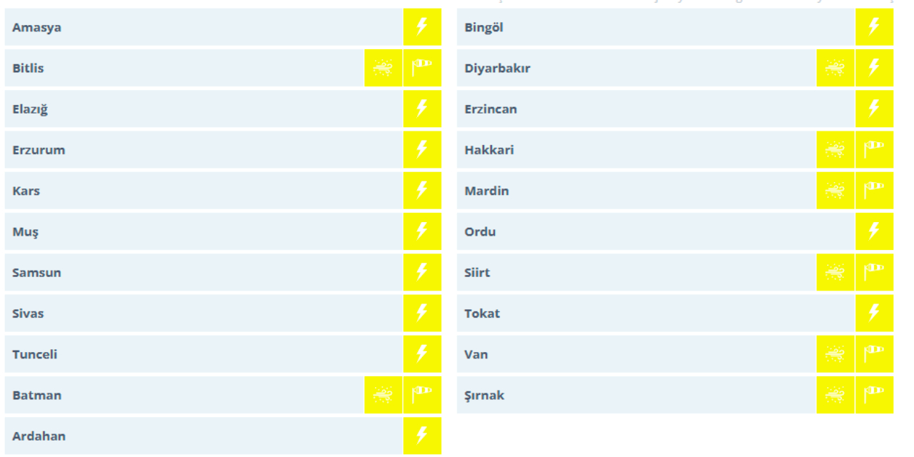 KUVVETLİ YAĞIŞ UYARISI: Yağışların Orta ve Doğu Karadeniz, Doğu Anadolu (Malatya, Van ve Iğdır hariç) ile Muğla, Aydın, Uşak, Denizli, Afyonkarahisar, Antalya’nın batı iç kesimleri, Isparta ve Burdur’un batısı, Ankara, Eskişehir’in doğusu, Çankırı, Kırşehir, Yozgat, Kırıkkale’nin kuzeyi, Sivas, Karabük’ün doğusu, Kastamonu, Adıyaman, Ş. Urfa’nın kuzeyi, Diyarbakır, Batman ve Siirt çevrelerinde yer yer kuvvetli olması beklendiğinden ani sel, su baskını, yıldırım, dolu yağışı, hortum, yağış anında kuvvetli rüzgar ve fırtına ile ulaşımda aksamalar gibi yaşanabilecek olumsuzluklara karşı dikkatli ve tedbirli olunması gerekmektedir.