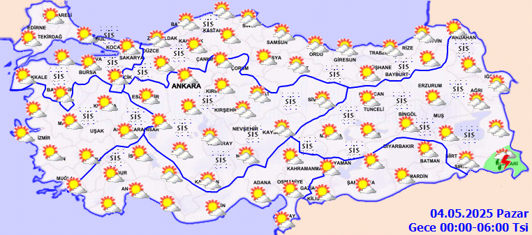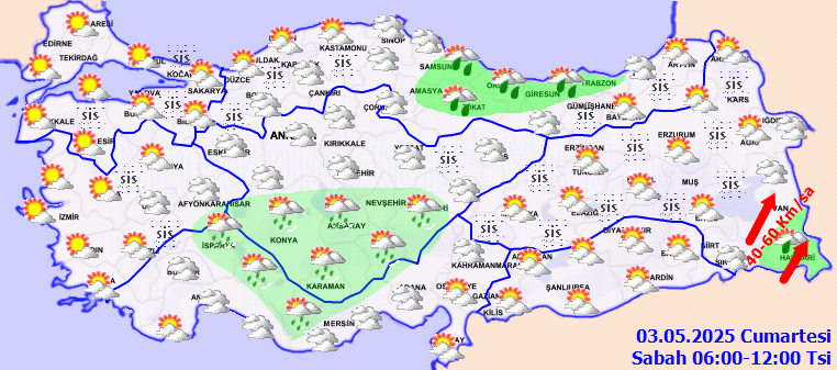 RÜZGAR: Batı kesimlerde kuzeyli, doğu kesimlerde güneyli yönlerden hafif ara sıra orta kuvvette, Doğu Anadolu’nun güneydoğusunda güney yönlerden kuvvetli olarak (40-60 km/saat) esmesi bekleniyor.