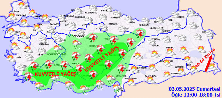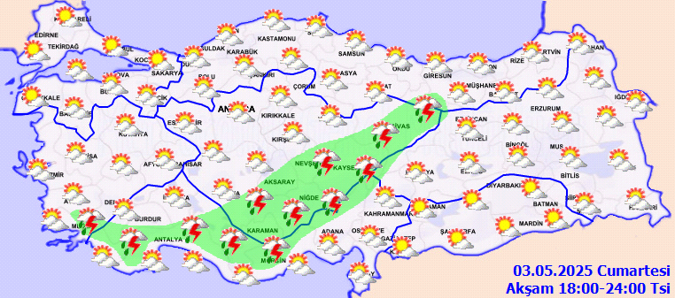 KUVVETLİ YAĞIŞ UYARISI: Yağışların; öğleden sonra Akdeniz’in iç kesimleri, Karaman, Aksaray, Nevşehir, Niğde ve Kayseri çevreleri ile Konya ve Sivas’ın güney ilçelerinde yerel kuvvetli olması beklendiğinden dikkatli ve tedbirli olunması gerekmektedir.