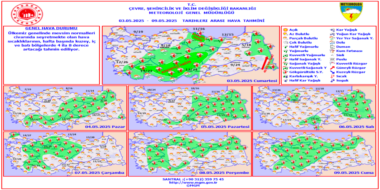 Meteoroloji Genel Müdürlüğü tarafından yapılan tahminlere göre: Türkiye genelinin parçalı yer yer çok bulutlu, Akdeniz, İç Anadolu’nun güney ve doğusu, Orta Karadeniz ile Muğla, Denizli, Afyonkarahisar, Giresun, Trabzon ve Hakkari çevrelerinin sağanak ve gök gürültülü sağanak yağışlı geçeceği tahmin ediliyor.